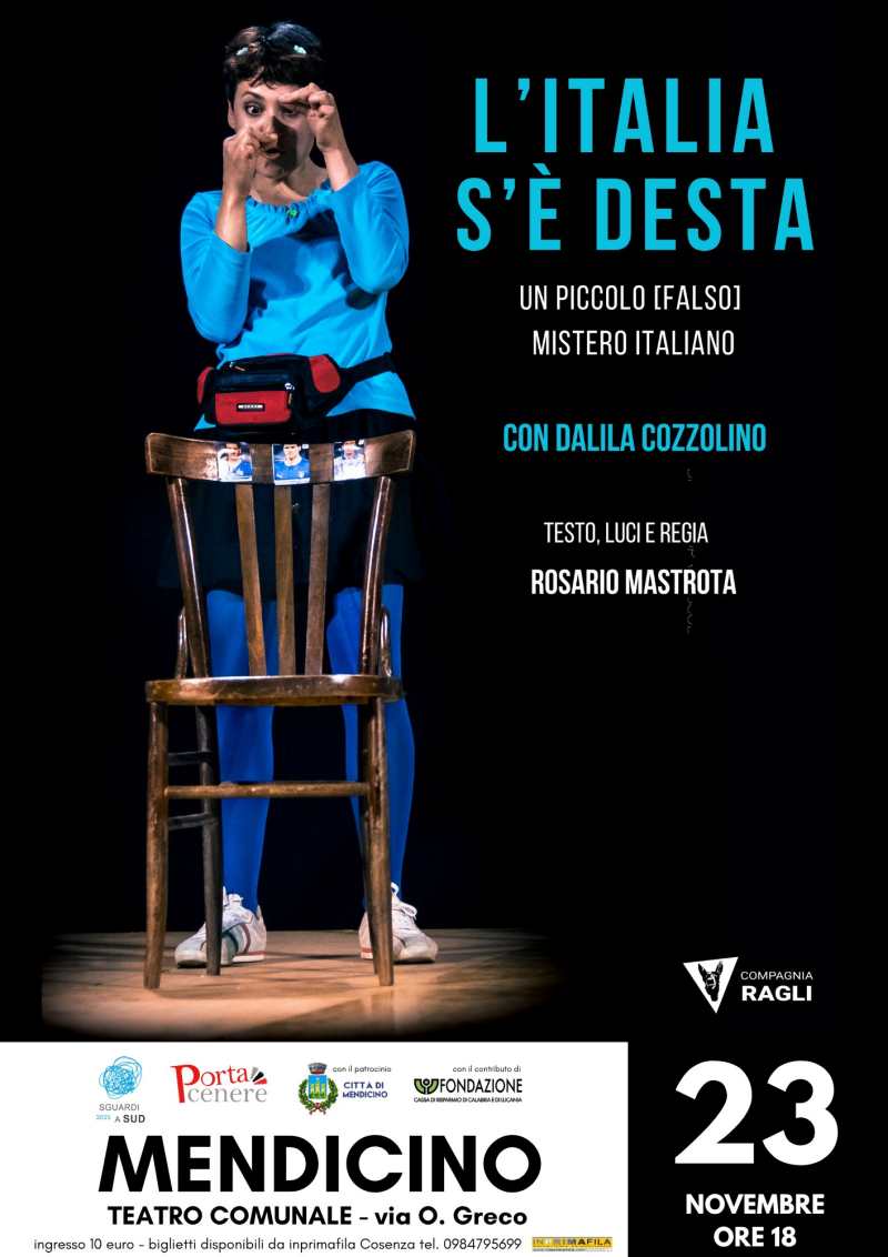 A inaugurare la stagione teatrale, il 23 novembre (alle ore 18), sarà la Compagnia Ragli con “L’Italia s’è desta. Un piccolo [falso] mistero italiano”, interpretato da Dalila Cozzolino, con testo, luci e regia firmati da Rosario Mastrota. Protagonista è Carletta, la “scema del paese”, una figura fragile e visionaria che assiste a un evento tanto improbabile quanto dirompente: il rapimento, ad opera della ‘ndrangheta, del pullman della Nazionale italiana di calcio a due mesi dai Mondiali. Una notizia-bomba che esplode sui media. Esercito, politica, giornalisti: tutti accorrono, travolti dall’ossessione della notizia generando un assalto cieco e famelico alla verità. Ma la verità – quella fragile e scomoda – sta sulle labbra di Carla, l’unica testimone.