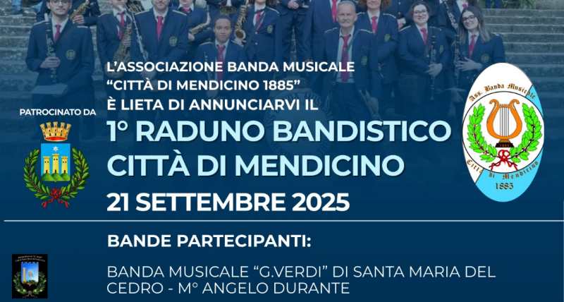 La città di Mendicino si prepara ad accogliere il 1° Raduno Bandistico “Città di Mendicino” in programma domenica 21 Settembre 2025. Un appuntamento che unirà tradizione, cultura e comunità, con l’organizzazione affidata all’Associazione Banda Musicale “Città di Mendicino 1885”, in collaborazione con l’associazione Prometeus, il gruppo dei Bretti e il patrocinio del Comune di Mendicino.