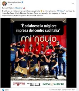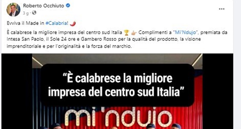 È quanto dichiarano Roberto Bonofiglio, Marco Zicca, Ornela Nokaj ed Eugenio Romano, soci fondatori di MI ‘NDUJO, la rete del panino calabrese veloce, territoriale, identitario e di qualità, ringraziando il Presidente della Regione Roberto Occhiuto per le parole di apprezzamento e di incoraggiamento espresse pubblicamente in occasione del riconoscimento assegnato all’esperienza aziendale calabrese da Intesa San Paolo come prima tra le 10 storie imprenditoriali di successo del Mezzogiorno.