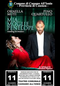 Organizzata dall’Amministrazione Comunale, Assessorato alle Politiche Sociali, guidato da Elisa Fasanella, andrà in scena Domenica 11 Dicembre 2022, alle ore 20:30, al “Teatro Comunale” di Cassano All’Ionio l’opera teatrale “Mia moglie Penelope” con Ornella Muti e Pino Quartullo.