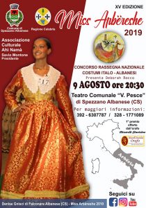 Nel teatro comunale “V. Pesce” di Spezzano Albanese il 9 agosto a partire dalle 20.30 si ritroveranno dunque le comunità arbëreshe d’Italia per gareggiare tra bellezza ed identità immateriale. Alla prima classificata andrà in dono il premio offerto dall’orafo Misurelli Stanislao di Spezzano Albanese. Un evento atteso da tutte le comunità d’Arbëria presenti in Italia che, come nel passato, promette di essere un grande evento di bellezza e valorizzazione della cultura delle minoranze linguistiche italiane.