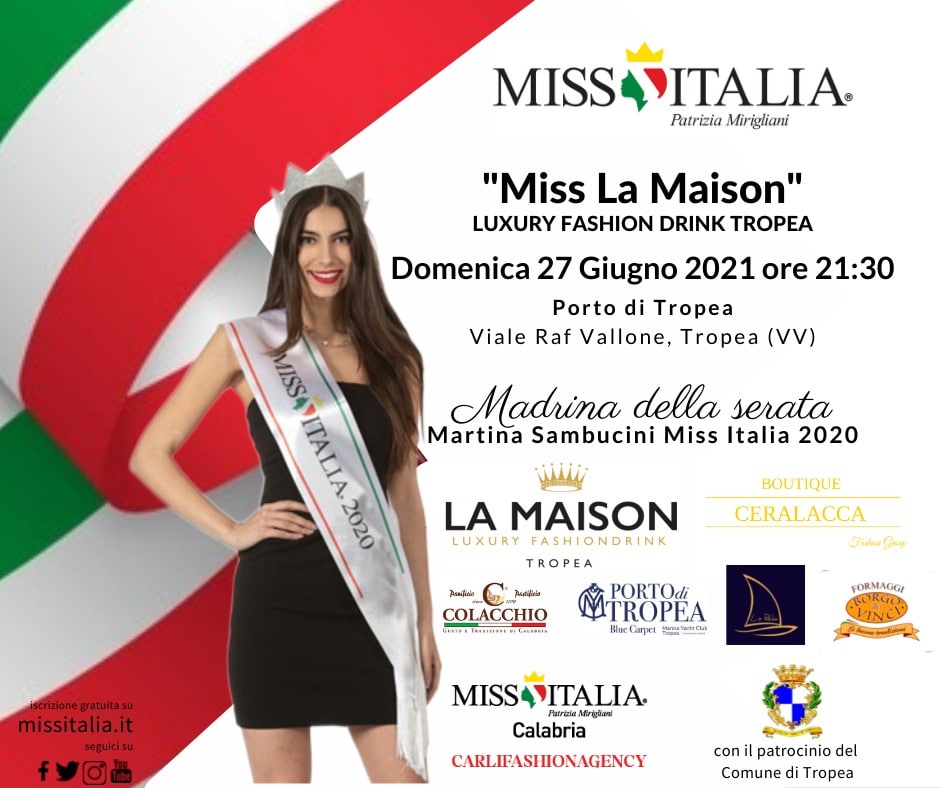 La Miss eletta si aggiudicherà la fascia di Miss La Maison Luxury Fashion Drink. L’evento prenderà il via alle 21:30 circa e sarà condotto da Andrea De Iacovo e Linda Suriano, arricchita dal corpo di ballo e dalle coreografie di Lia Molinaro, con la partecipazione di alcuni talenti canori calabresi. Si ringrazia il comune di Tropea per il patrocinio, il porto di Tropea, Colacchio, Borgo dei Vinci, e La Rada.