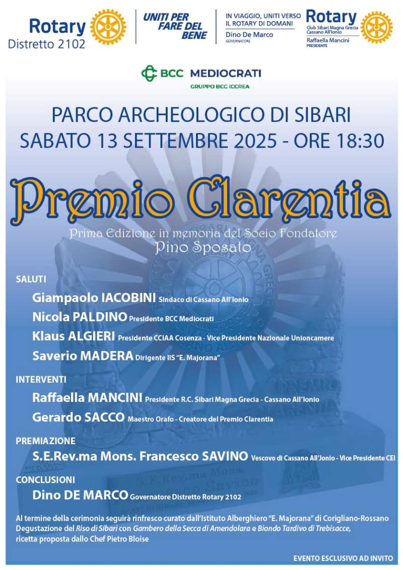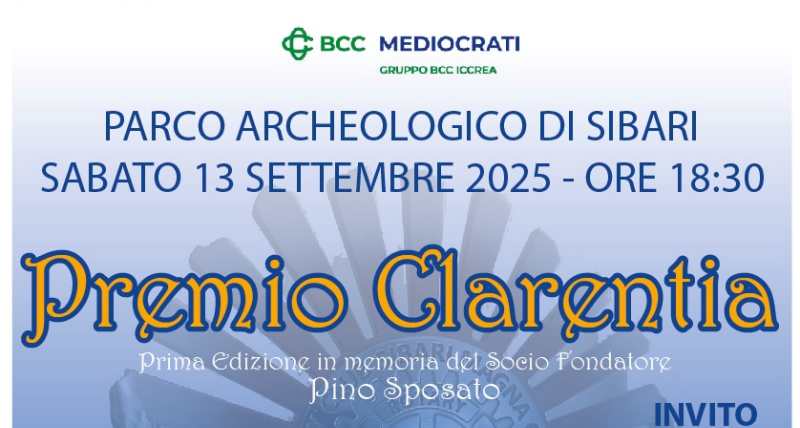 Sabato 13 settembre 2025, alle ore 18:30, presso il Parco Archeologico di Sibari, il Rotary Club Sibari Magna Grecia – Cassano All’Ionio inaugurerà la Prima Edizione del “Premio Clarentia”, istituito a partire da quest’anno sociale per identificare il Club e valorizzare, negli anni a venire, quanti si distinguono per l’impegno nel proteggere, guidare, promuovere e valorizzare il nostro territorio.