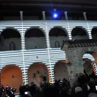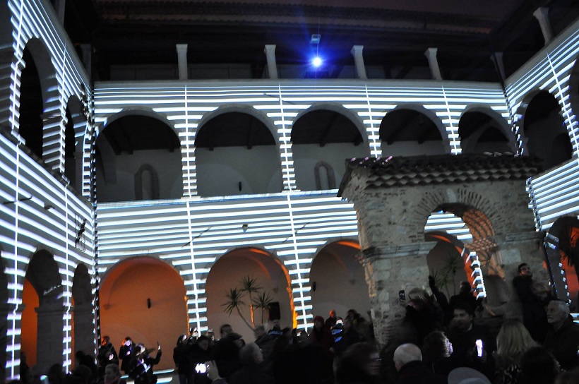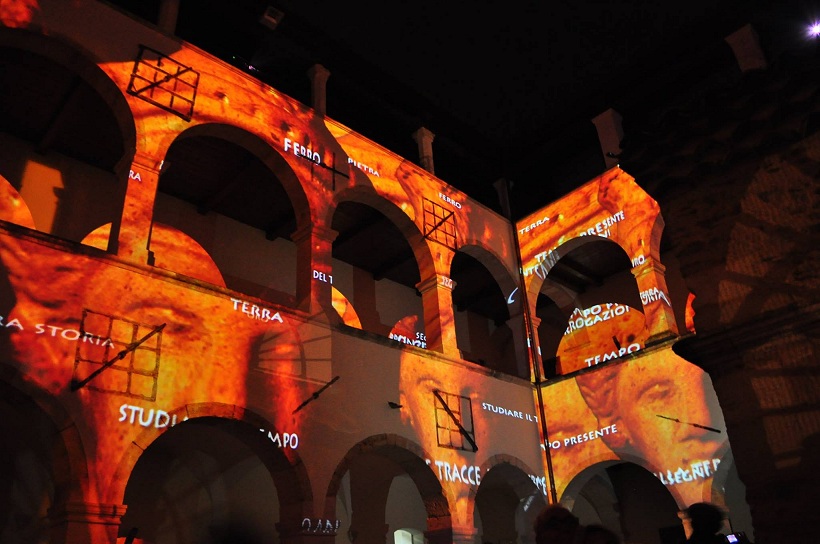 Infatti, l’opera di Cauteruccio proietta le forme dei reperti archeologici custoditi nel Museo sulle quattro facciate del chiostro, in un dialogo virtuale con lo spazio che, attraverso l’uso di tecnologie innovative, esalta contestualmente l’architettura del luogo così come i suoi contenuti, trasferendone incisivamente la sua identità e suggerendo nuovi percorsi di conoscenza, anche della collezione archeologica.