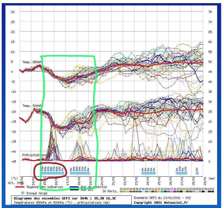 Come si può vedere dal grafico la possibilità di rischio neve a Cosenza è del 77% per il modello americano GFS nella serata/notte tra venerdì e sabato, ma non è da escludere che la dama bianca possa fare la sua comparsa a Cosenza nella notte tra domenica e lunedì cosa che appare, al momento, la finestra temporale più probabile.