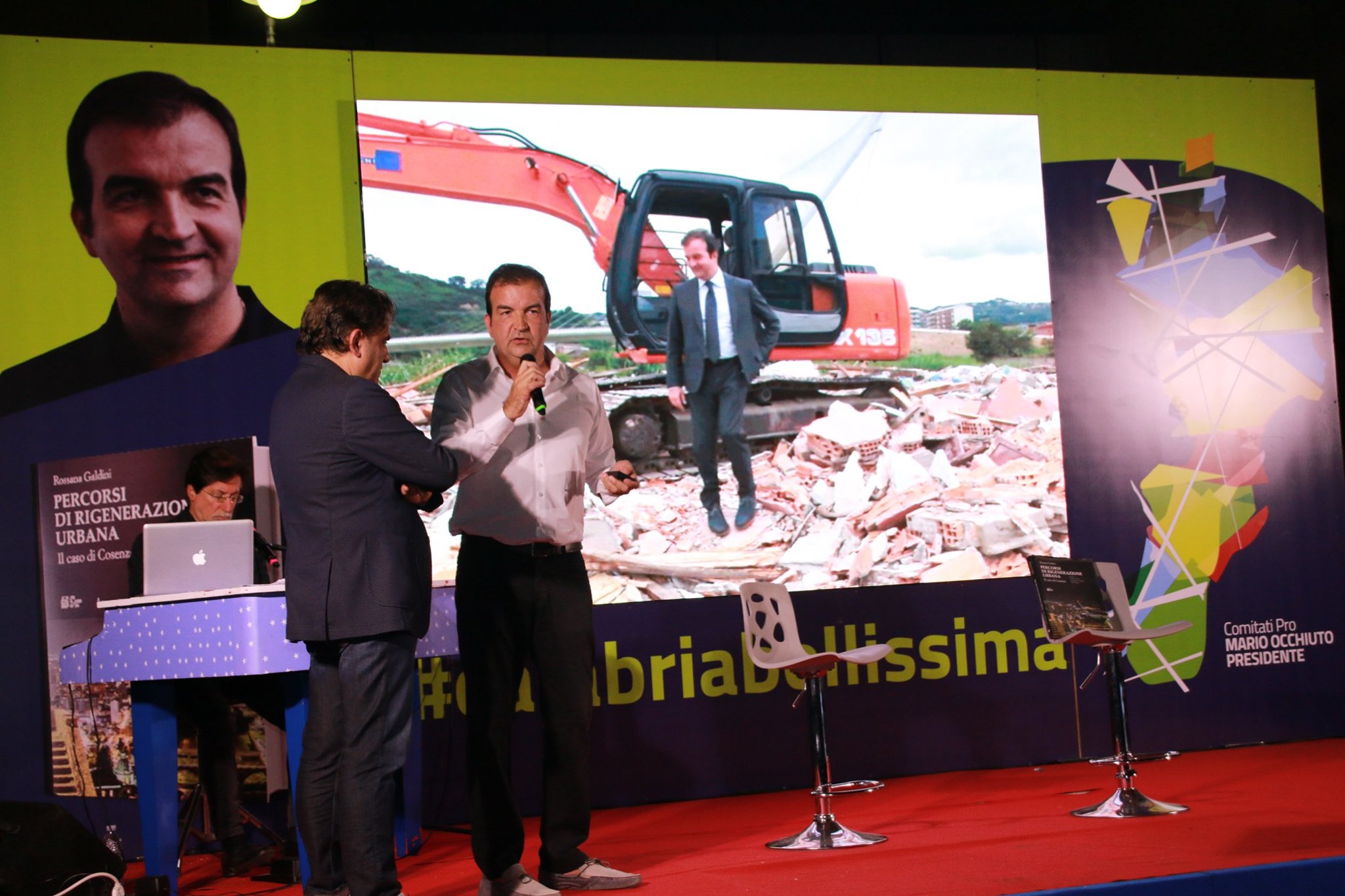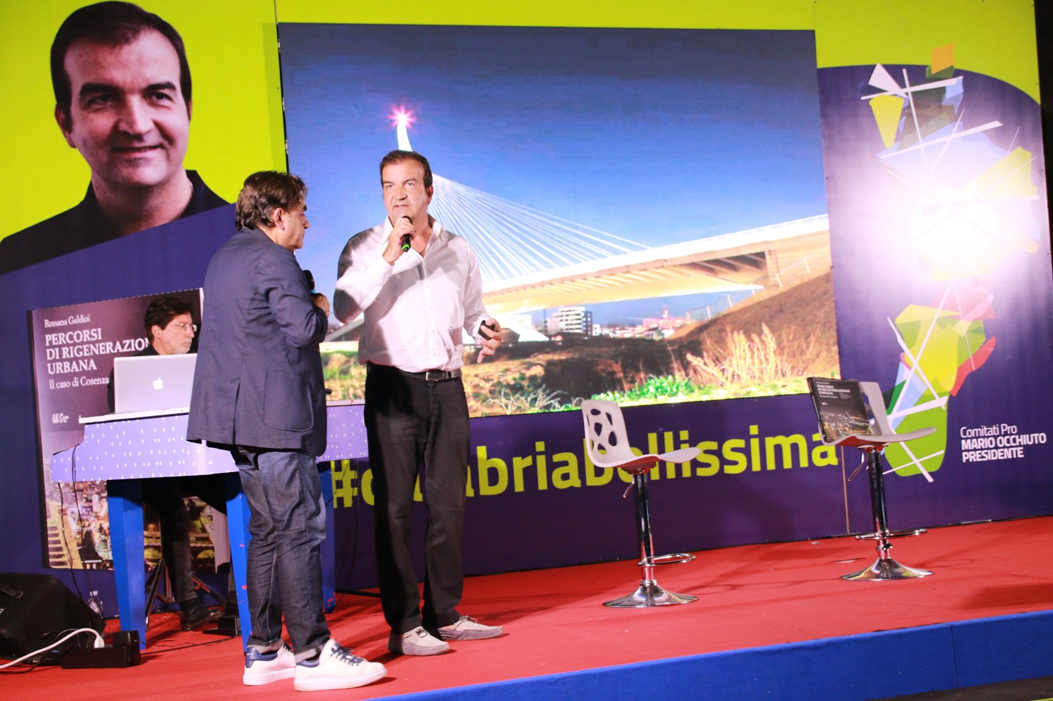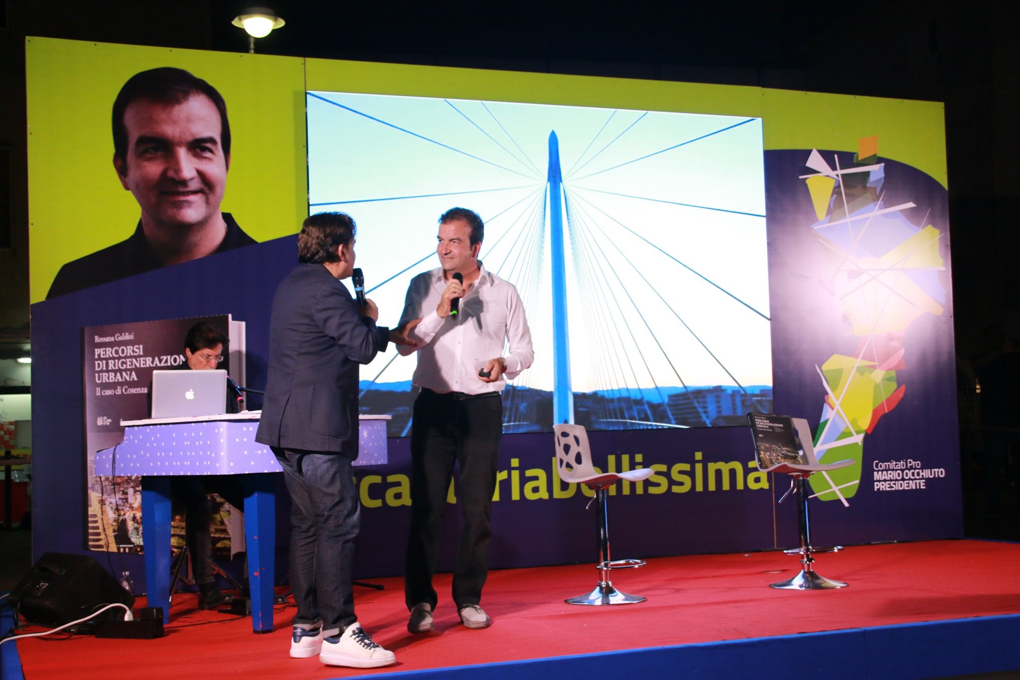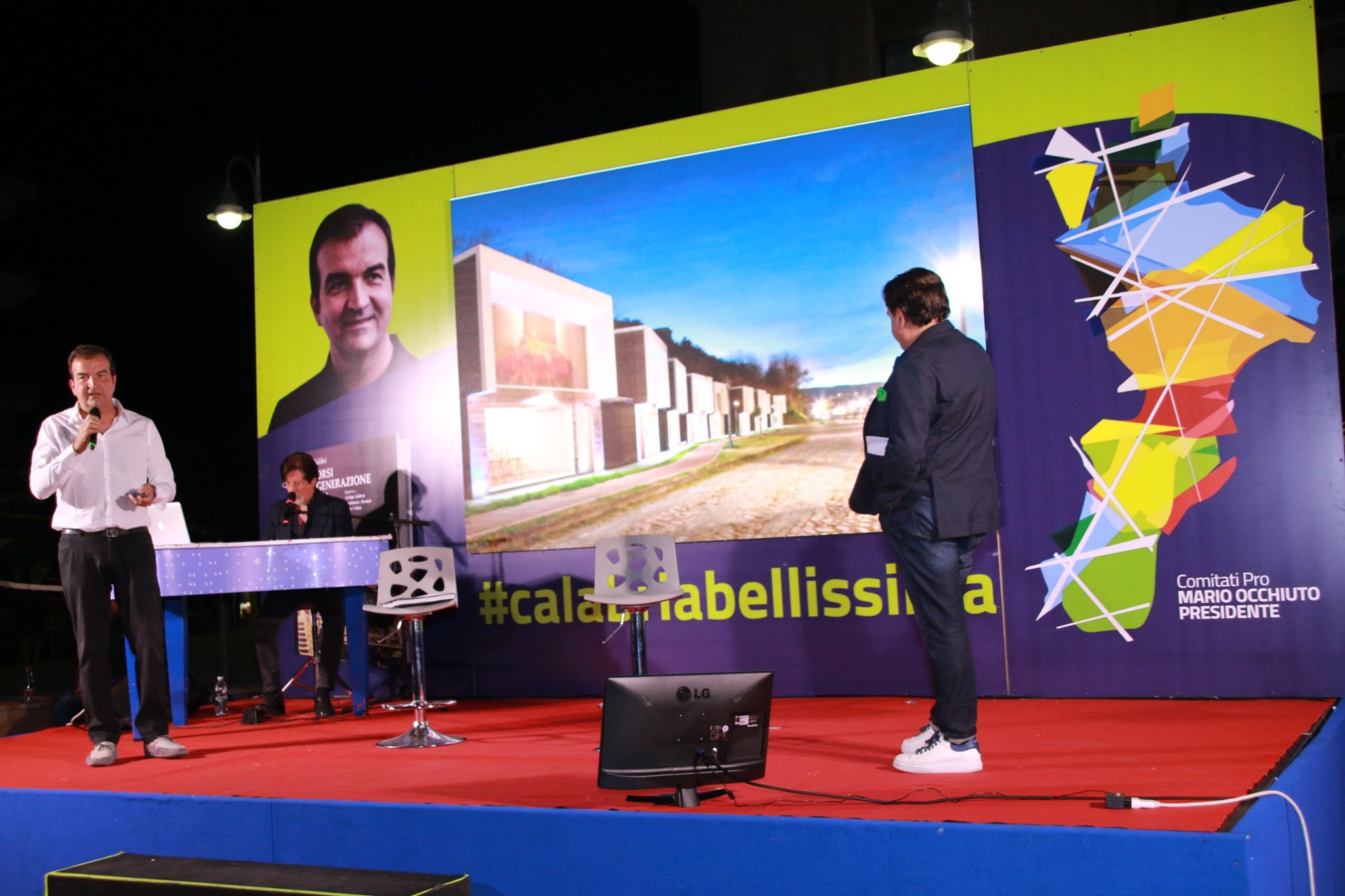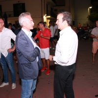 Si cita l’abbattimento “intelligente” di un campo rom, richiamato anche dall’allora Ministero degli Interni guidato da Alfano come esempio a cui guardare da parte di altri Comuni. Occhiuto ormai ha un feeling diretto con la gente, ne avverte gli umori. “Prego maestro”, dice rivolgendosi al pianista Paolo Aragona che con Francesco Occhiuzzi divide il palco con lui. Una breve pausa, la musica di Gaber. Poi si riparte davanti alla platea gremita di piazza Portofino di Schiavonea. Ricorda, Occhiuto, l’aneddoto ormai noto che gli è caro, quello che riprende ogni volta che parla del ponte di Calatrava: la lettera di un giovane che vive nel quartiere di Gergeri e che da bambino si vergognava a vivere lì, mentre oggi, grazie alla rigenerazione realizzata dall’amministrazione Occhiuto, ne va orgoglioso e si sente fiero di essere residente nella zona un tempo degradata.