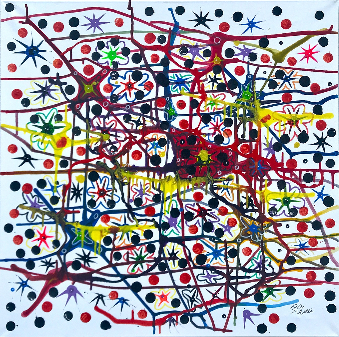 Il dipinto dal titolo: HOPE – Speranza “che il virus finisca nella rete dell’amore e diventi fiore” realizzato su tela cm80x80 con colori acrilici e acrilici fluorescenti è in perfetto stile Colucci come i tanti ammirati nelle sue moltissime mostre personali in tutta Italia e molti eventi all’estero tra cui: Londra, Edimburgo, Montecarlo, Miami, New York ed altre, dove ha esposto “Art in Music” una vera esperienza sensoriale audiovisiva.