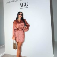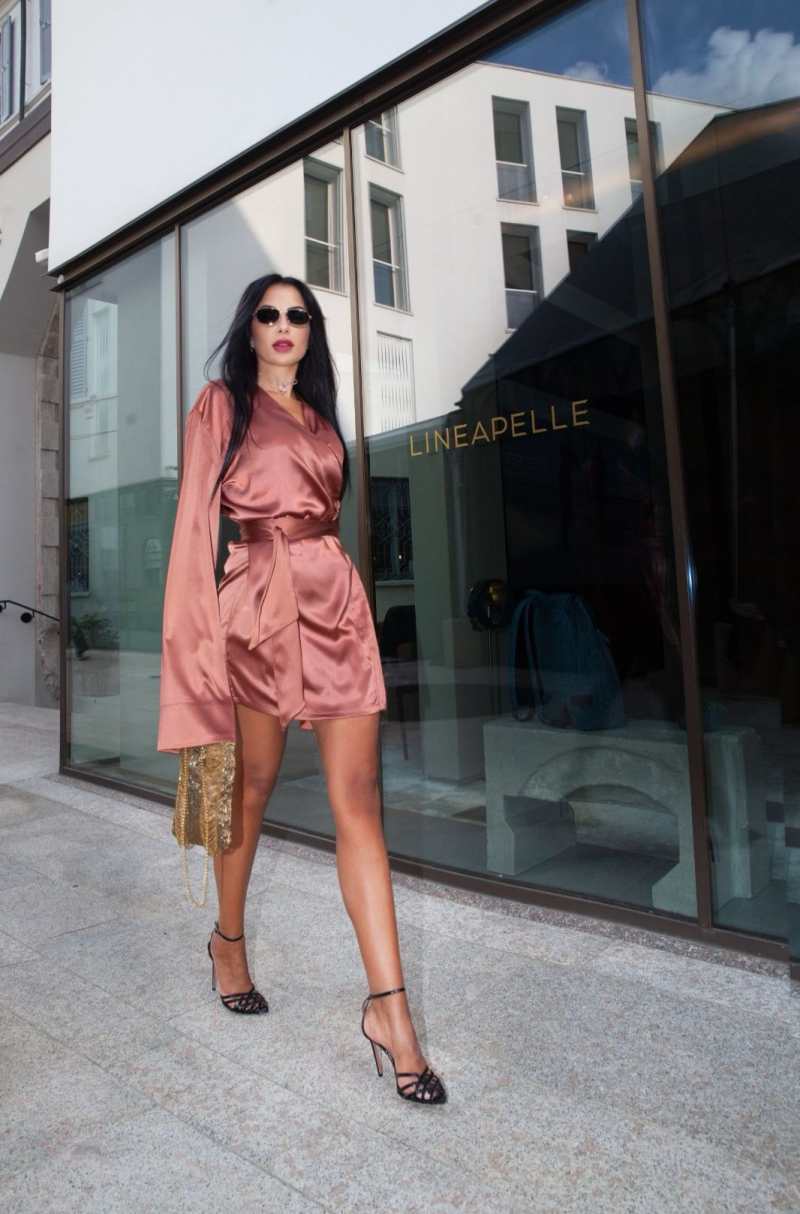 Per l’occasione, Ortensia ha scelto un look sofisticato e al tempo stesso sorprendentemente versatile: un vestito in raso a portafoglio con chiusura regolabile e laccetto interno, pensato per garantire una vestibilità impeccabile. A valorizzare ulteriormente la silhouette, la cintura maxi in tessuto, da annodare in vita o a doppio giro, capace di creare un raffinato effetto bustino strutturato. Un outfit femminile e chic, che gioca con i codici dell’effetto lingerie e della vestaglia da giorno, reinterpretati in chiave glamour.