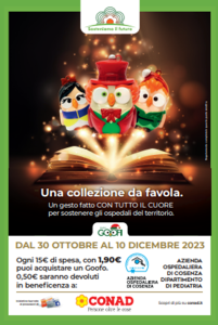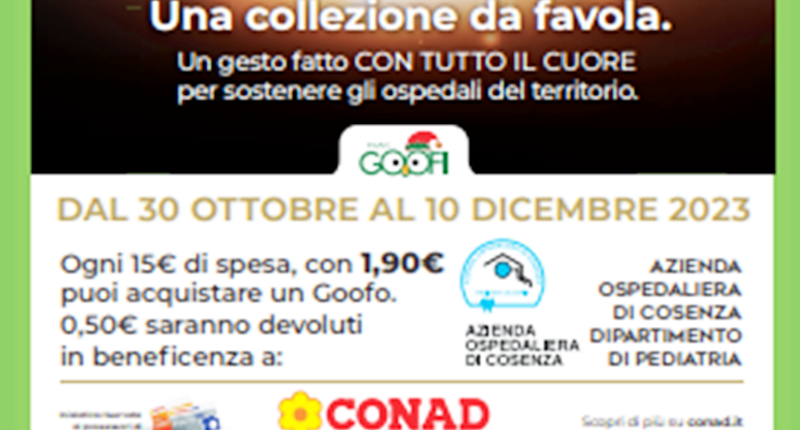 Dal 30 ottobre nei punti vendita Conad la nuova collezione premi eco-friendly e solidale “Una collezione da favola” composta da 12 soggetti natalizi per l’addobbo e la decorazione. In Calabria, per ogni prodotto distribuito, PAC 2000A Conad devolverà 50 centesimi a sostegno del Reparto pediatrico dell’Ospedale Annunziata di Cosenza