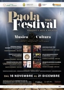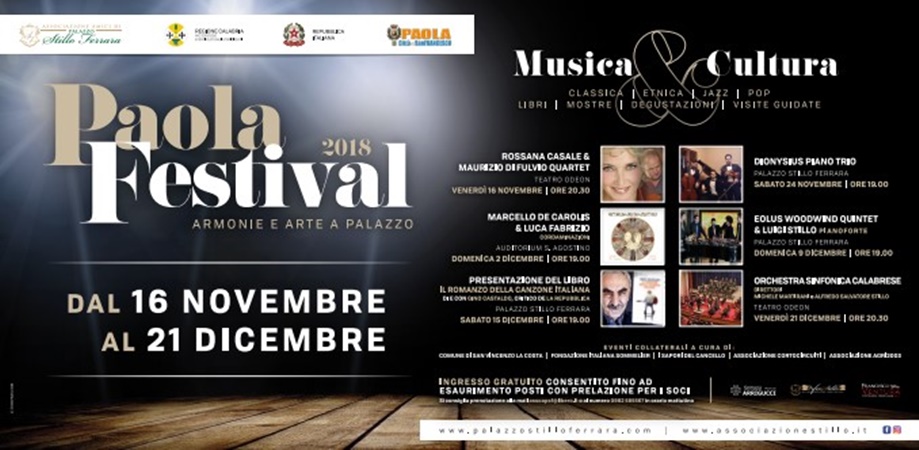 Si terrà mercoledì 14 novembre, alle ore 10,00, nel salone convegni della dimora storica “Palazzo Stillo Ferrara”, a Paola, la presentazione del programma del “Paola Festival 2018 – Armonie e Arte a Palazzo”, che si svolgerà dal 16 novembre al 21 dicembre.