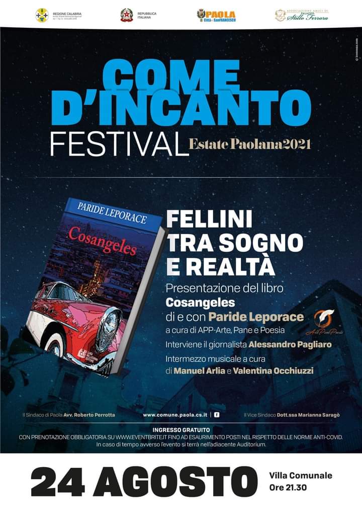 A partire dalle ore 21:30, presso la Villa Comunale della città di Paola, prenderà vita l’iniziativa “Fellini tra sogno e realtà”. Insieme all’autore di “Cosangeles” Paride Leporace e al giornalista Alessandro Pagliaro cercheremo di guardare con occhi nuovi al periodo che ha caratterizzato l’epopea del lavoro felliniano. Con spunti e riflessioni anche sulla “Dolce vita”.