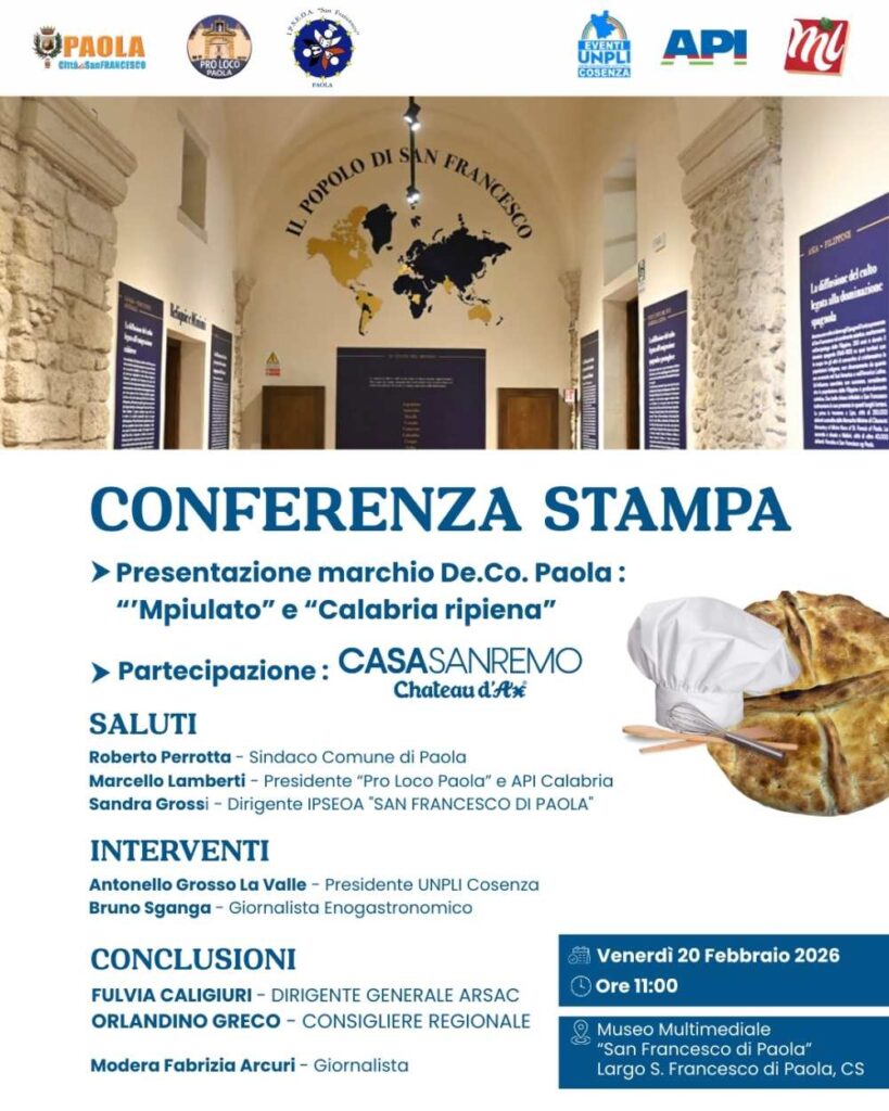 In questa cornice si inserisce la conferenza stampa in programma venerdì 20 febbraio 2026, alle ore 11.00, presso il Museo Multimediale di San Francesco di Paola, dedicata alla presentazione del marchio De.Co. e di due prodotti simbolo che, attraverso il gusto, raccontano l’identità del comune tirrenico. Un appuntamento che mette al centro la capacità delle tradizioni locali di diventare racconto, attrattività e promozione, in una visione condivisa.
