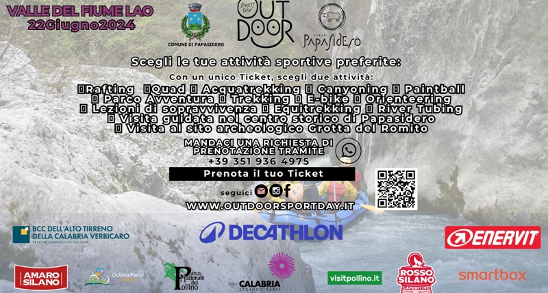 Per il terzo anno consecutivo, Papasidero è pronta ad accogliere tutti i turisti amatori e gli sportivi che, tramite la prenotazione e l’acquisto di un ticket di 35,00 euro per gli adulti e 25,00 euro per i bambini, darà la possibilità di effettuare due escursioni a scelta tra: rafting, quad, acqua trekking, canyoning, paintball, parco avventura, trekking, e-bike, orienteering, lezioni di sopravvivenza, equitrekking, river tubing, visita guidata nel centro storico di Papasidero, visita guidata al sito archeologico della Grotta del Romito e partecipazione alla mini maratona.