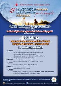 Sabato 13 settembre a Paravati (VV), nella terra benedetta di Natuzza Evolo, dalle ore 14.00, in seno all’anno giubilare, si terrà il 18° Pellegrinaggio Regionale delle Famiglie per la Famiglia “Non perdere la Speranza. Dalle famiglie viene generato il futuro dei popoli”. (Papa Leone XIV). Da Piazza Nassirya, dopo l’accoglienza e le testimonianze, si snoderà il pellegrinaggio che arriverà al Santuario Cuore Immacolato di Maria Rifugio delle Anime. Al termine ci sarà la solenne concelebrazione eucaristica presieduta dal Vescovo di Mileto-Nicotera-Tropea S.E. mons. Attilio Nostro.