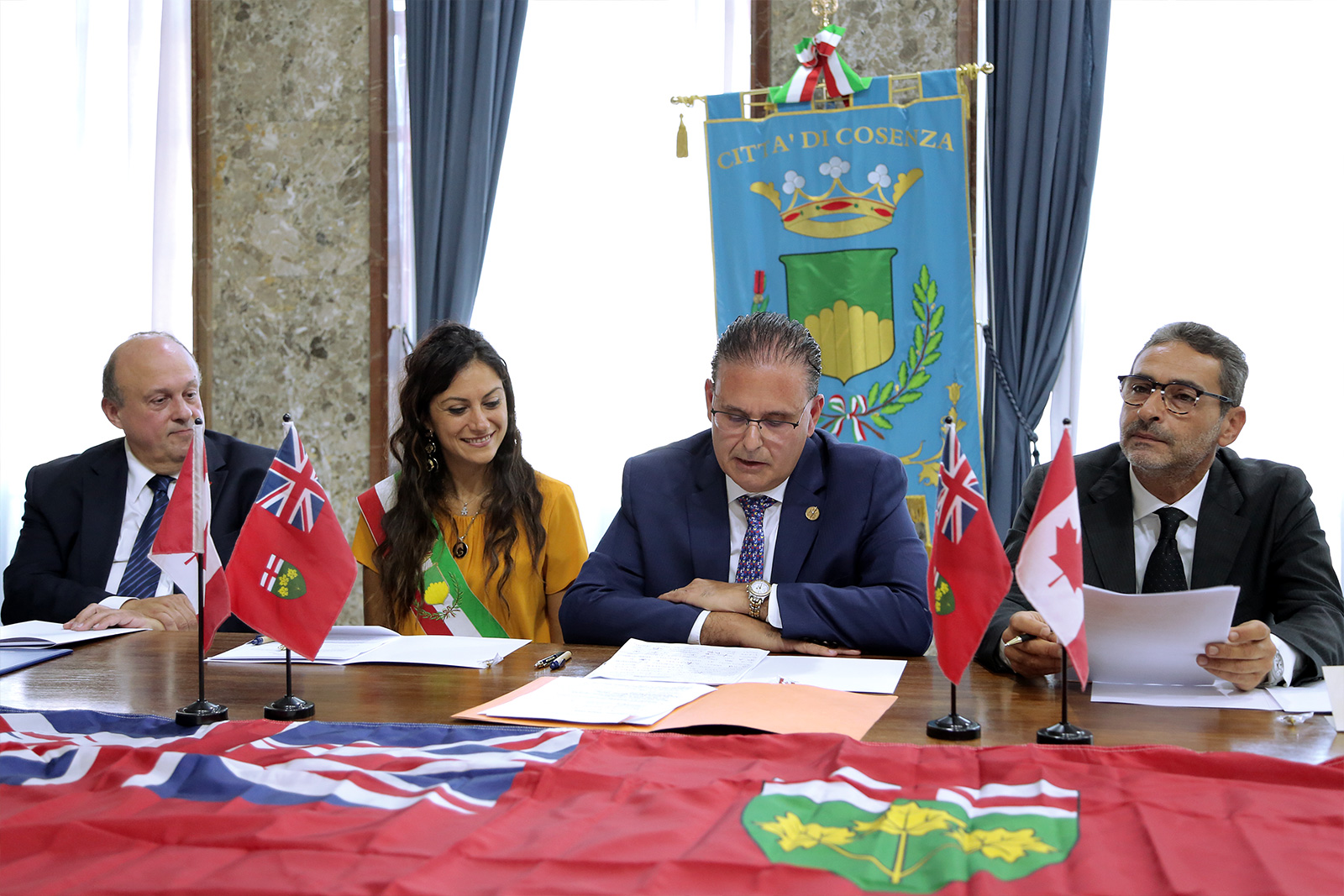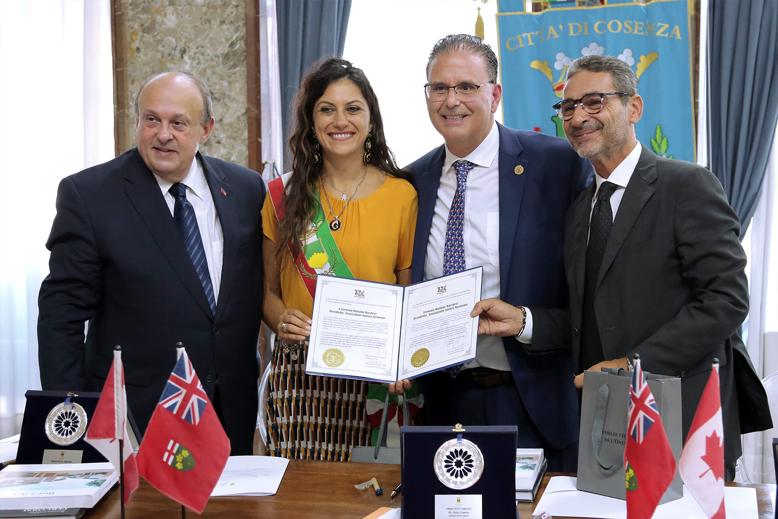 Al termine dell’incontro, il consueto scambio di doni: l’Assessore Succurro ha consegnato agli ospiti canadesi una riproduzione del rosone della Cattedrale di Cosenza e due pubblicazioni sulla città, ricevendo in cambio la bandiera canadese. Subito dopo la firma, l’Assessore Succurro ha accompagnato i rappresentanti dell’Ontario in un tour organizzato per far visitare loro i monumenti e le bellezze della città.