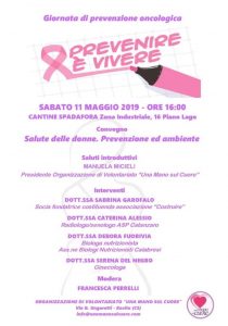“Prevenzione in cantina” è la prima iniziativa ufficiale organizzata dall’associazione di volontariato “Una Mano Sul Cuore” che si terrà sabato 11 Maggio a Piano Lago presso le Cantine Spadafora. Durante la mattinata verranno eseguite mammografie, ecografie al seno ed ecografie tiroidee grazie al supporto dell’ADIS Cosenza Onlus che, con il camper itinerante, garantisce ogni giorno importanti iniziative di prevenzione.