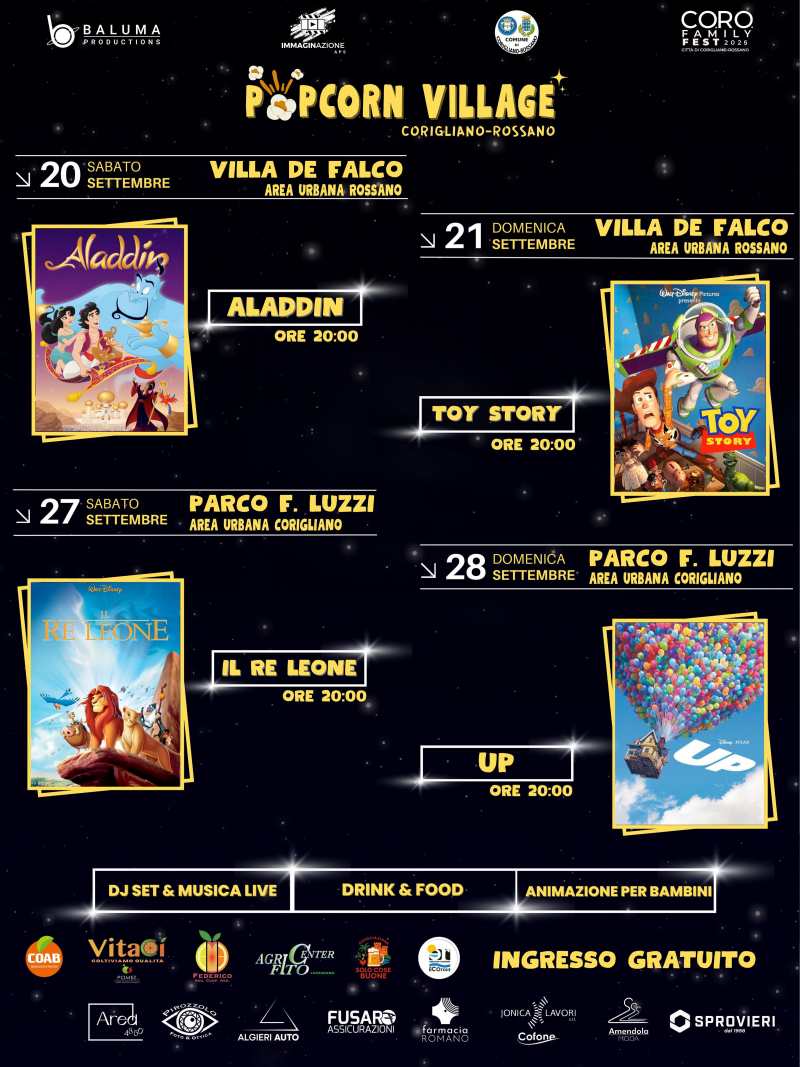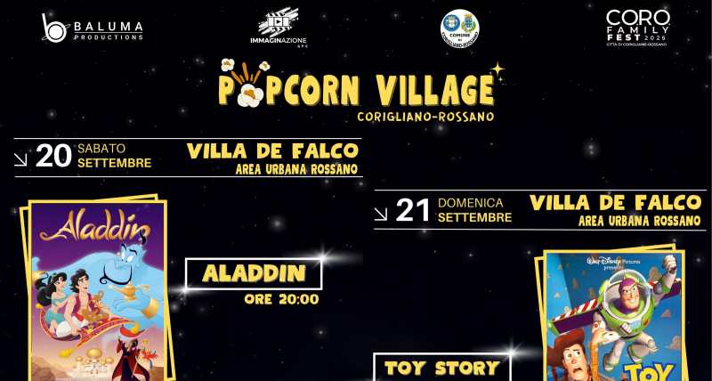 Prende il via nel prossimo fine settimana il “POPCORN VILLAGE”, evento culturale e ricreativo rivolto a famiglie, bambini e giovani, che animerà i due principali parchi urbani della città – Villa De Falco (area urbana Rossano) e Parco Fabiana Luzzi (area urbana Corigliano) – con cinema all’aperto, musica, intrattenimento e attività accessibili a tutta la cittadinanza.