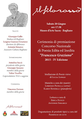 L’evento, dedicato al fondatore dell’associazione “ilfilorosso”, Francesco Graziano, è giunto alla sua quarta edizione e ci si accinge a premiare le poesie vincitrici che verranno lette da Antonio Simarco ed Erica Fuoco, accompagnati dalle note dei maestri Lorenzo Patella e Karin Renzelli.