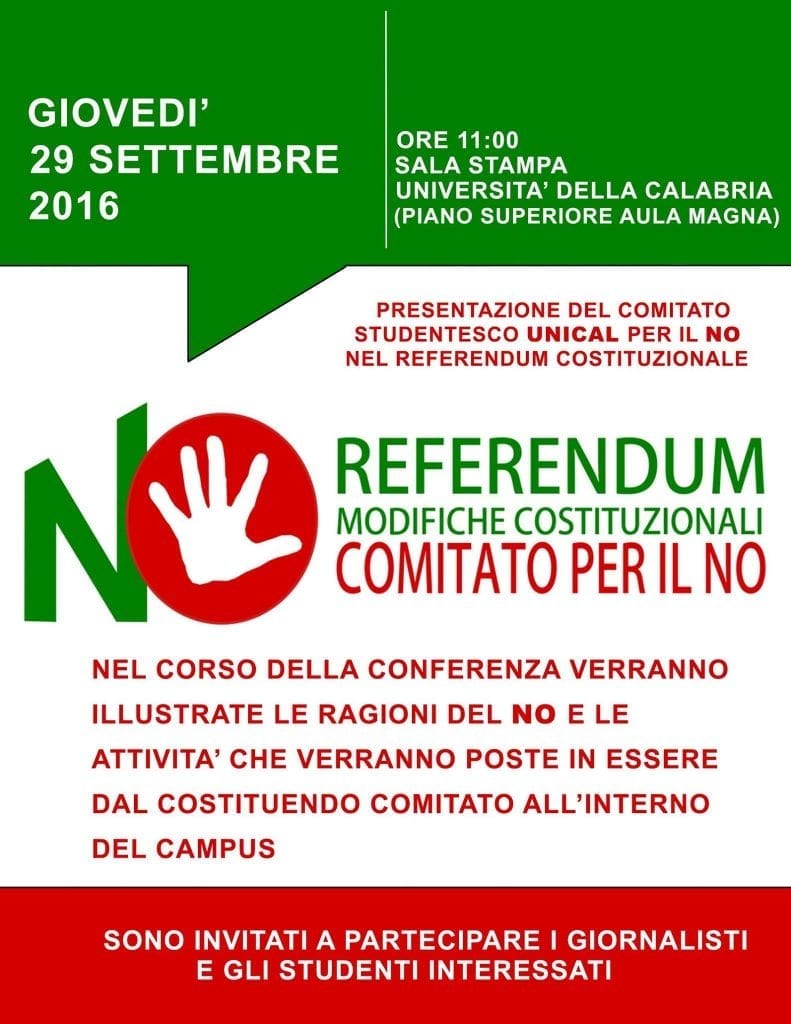 Giornalisti, cittadini e studenti interessati sono invitati domani mattina presso la sala stampa dell’ Università della Calabria alle ore 11:00 per partecipare alla presentazione del Comitato UniCal per il no al referendum costituzionale