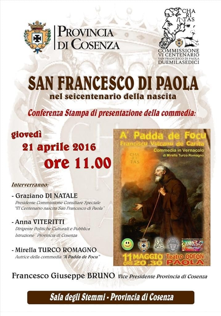 Una nuova iniziativa della Commissione provinciale speciale per il secentenario della nascita di San Francesco di Paola, con la presentazione della commedia “A’ padda de focu. Franciscu Vulcanu de Carità”. La rappresentazione teatrale in vernacolo, sarà presentata giovedì 21 aprile, alle ore 11,  nella sala degli Stemmi della Provincia di Cosenza.