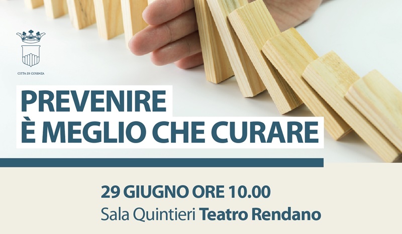 L’importanza della prevenzione, con particolare riferimento alle patologie urologiche, sarà al centro dell’importante convegno medico, in programma venerdì 29 giugno nella Sala “Quintieri” del Teatro “Rendano”, con inizio alle ore 10,00, e promosso dalla Commissione consiliare sanità di Palazzo dei Bruzi, presieduta dalla consigliera comunale Maria Teresa De Marco, in collaborazione con la Fondazione “Totò Morgana” che si occupa prevalentemente di solidarietà e prevenzione uro-andrologica. Tema del convegno è “Prevenire è meglio che curare” che, oltre ad uno slogan ricorrente, rappresenta un vero e proprio imperativo categorico sul quale l’iniziativa della Commissione consiliare sanità intende focalizzare l’attenzione.