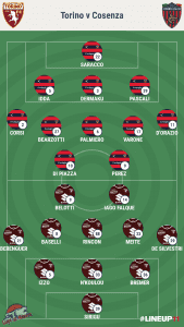 TORINO (3-5-2): 39 Sirigu; 36 Bremer, 33 N’Koulou, 5 Izzo; 29 De Silvestri, 23 Meite, 88 Rincon, 8 Baselli, 21 Berenguer; 14 Iago Falque, 9 Belotti. All. Mazzarri