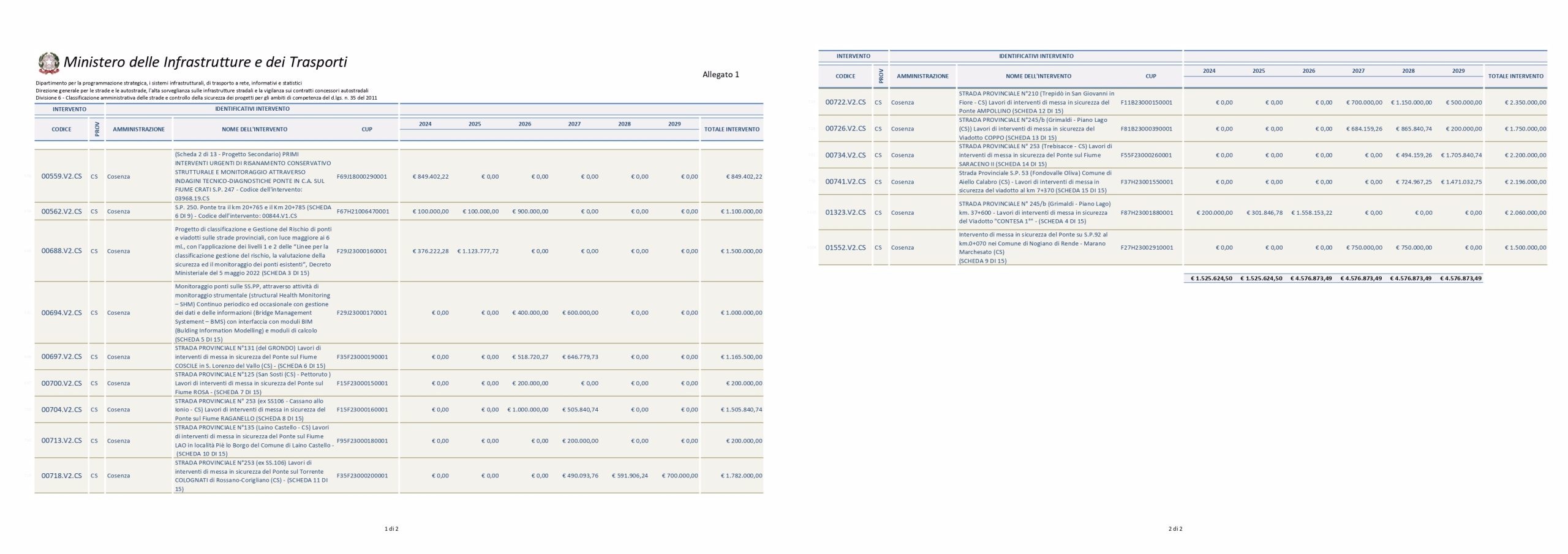 Il Decreto Ministeriale con il quale è stato finanziato il programma sui ponti e viadotti prevede, per la Provincia di Cosenza, l’ammissione a finanziamento per tredici interventi mirati di ristrutturazione viadotti che necessitano di interventi immediati. Un ulteriore intervento di € 1.500.000 consentirà di procedere alla definizione della classe di Attenzione di altre 400 infrastrutture fra ponti e viadotti; un milione di euro è invece previsto per il piano di monitoraggio dei ponti, che garantirà sicurezza nel tempo.