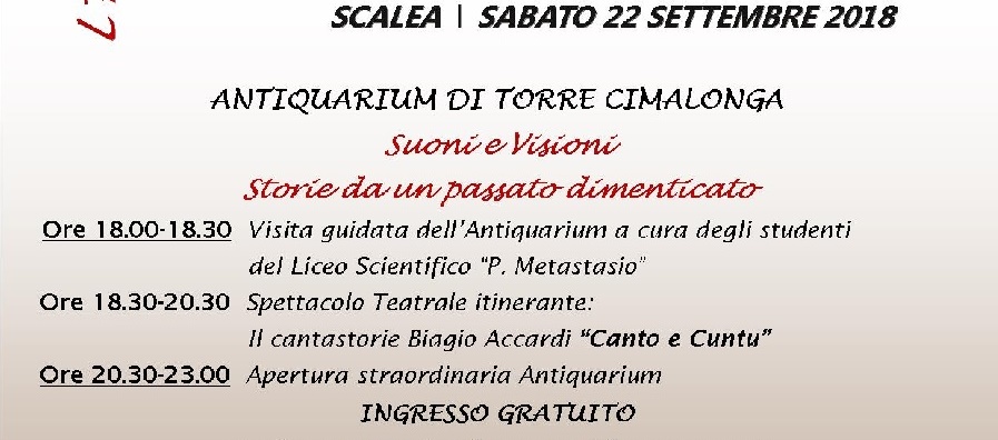 L’Antiquarium di Scalea, in collaborazione con il Liceo Scientifico “Pietro Metastasio”, l’associazione Arca, il Consorzio ECOtur ed il patrocinio del Comune di Scalea, nell’ambito delle Giornate Europee del Patrimonio, promuove il prossimo 22 settembre un evento volto alla conoscenza e alla condivisione del beni materiali ed immateriali del proprio territorio. “Suoni e visioni. Storie da […]