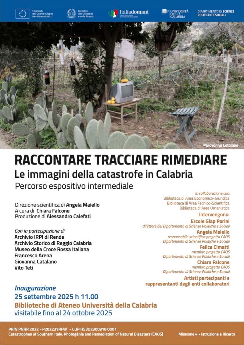 Nell’ambito del progetto PRIN “CAOS – Catastrophes of Southern Italy. Photogénie and remediation of natural disasters” (PI Angela Maiello), prende vita all’Università della Calabria la mostra “Raccontare. Tracciare. Rimediare. Le immagini della catastrofe in Calabria”, visitabile gratuitamente dal 25 settembre al 24 ottobre 2025 presso il polo interbibliotecario di Ateneo