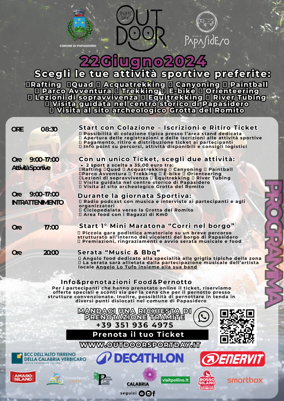 Per il terzo anno consecutivo, Papasidero è pronta ad accogliere tutti i turisti amatori e gli sportivi che, tramite la prenotazione e l’acquisto di un ticket di 35,00 euro per gli adulti e 25,00 euro per i bambini, darà la possibilità di effettuare due escursioni a scelta tra: rafting, quad, acqua trekking, canyoning, paintball, parco avventura, trekking, e-bike, orienteering, lezioni di sopravvivenza, equitrekking, rivertubing, visita guidata nel centro storico di Papasidero, visita guidata al sito archeologico della Grotta del Romito e partecipazione alla mini maratona.
