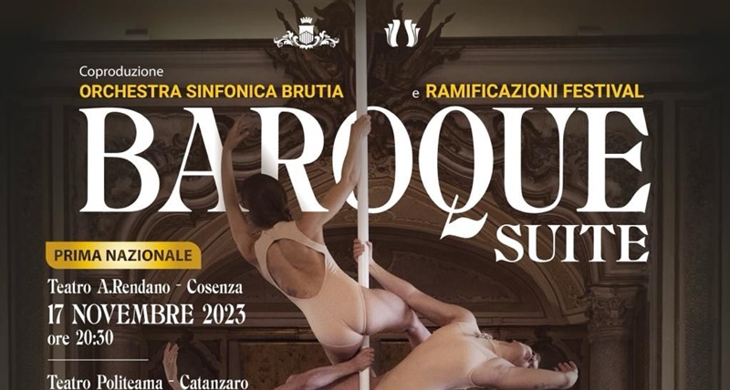 “Baroque Suite” è una coproduzione di Ramificazioni Festival e Orchestra Sinfonica Brutia, un atto unico per la danza contemporanea, le arti performative e la musica classica barocca, per la regia di Filippo Stabile. La Compagnia Create Danza di Cosenza incontra la Compagnia Colonna di Firenze e la Damnedancers di Roma per una nuova e inedita creazione ispirata al Barocco Europeo, un connubio raffinato messo in risalto dalla musica dal vivo dell’Orchestra Sinfonica Brutia di Cosenza diretta dal Maestro Patrizio Germone e con alcune incursioni di Musica Elettronica a cura del Maestro Francesco Perri. Un progetto che vede in scena 30 musicisti, la Soprano Tonia Langella e un corpo di ballo di 30 elementi, in cui passato, presente e futuro danzano riflettendosi nei lampi luminosi e nelle forme fluide tra la danza contemporanea, le danze urbane le arti performative aeree come la pole dance e il cerchio aereo.