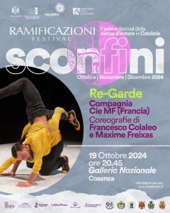 Primo appuntamento in programma sabato 19 ottobre alle 20:45 alla Galleria Nazionale di Cosenza con “Re-Garde“, lavoro del duo francese Cie MF, formato dai danzatori/coreografi Maxime Freixas e Francesco Colaleo, che, affiancati dalla Compagnia Artemis Danza, daranno forma alla loro danza potente e atletica, capace di esprimere una delicata armonia, inserita in una visione carnale ed umana della vita in tempi moderni. A seguire, incursioni danzate a cura degli allievi che hanno preso parte al workshop con i coreografi. Il costo del biglietto per partecipare allo spettacolo è di € 10,00, acquistabile direttamente in cassa prima dell’evento. Sarà inoltre possibile fino alle 20:15 accedere e visitare la Galleria Nazionale usuefrendo di tariffe ridotte.