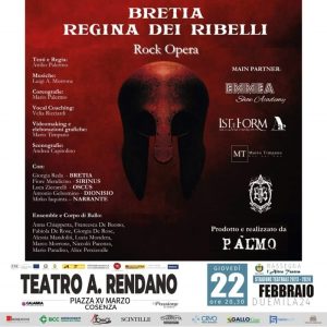 Un’opera rock di assoluto valore artistico, storico e culturale, che ci riporta alle origini della città di Cosenza. “Bretia Regina dei Ribelli – Rock Opera” è il primo musical liberamente ispirato alla storia legata al popolo dei Bretti e al mito di Donna Brettia, la guerriera a capo della rivolta che ne sancì la libertà. Lo spettacolo, scritto e diretto dal regista cosentino Attilio Palermo, andrà in scena giovedì 22 febbraio, alle ore 20.30, al Teatro Rendano di Cosenza.