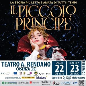 Il Piccolo Principe è un racconto senza tempo che ha incantato grandi e piccini per diverse generazioni. È il libro più tradotto dopo la Bibbia (oltre 500 lingue e dialetti) e ha venduto più di 200 milioni di copie in tutto il mondo (19 milioni solo in Italia). Proprio per questo, lo spettacolo è stato inserito anche all’interno della Rassegna “Il Teatro fa Scuola” e andrà in scena, in esclusiva, lunedì 24 febbraio, ore 9.30, per gli studenti delle scuole di ogni ordine e grado. Parteciperanno alunni degli istituti di Cosenza, Rende, Cassano all’Ionio, Mangone, San Pietro in Guarano, Acri. Lo spettacolo regalerà al pubblico emozioni forti e autentiche, aiutando grandi e piccini a capire quali sono le cose veramente importanti, quelle che vengono insegnate da bambini ma che si dimenticano una volta diventati adulti. Spetterà proprio al Piccolo Principe, eterno bambino, rinfrescare la memoria.