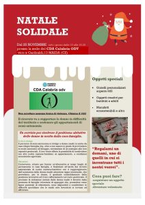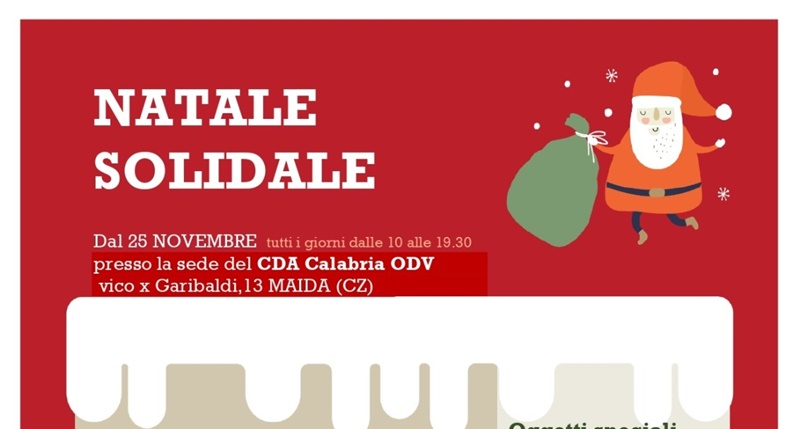 Il Natale solidale inizia il 25 novembre prossimo e andrà avanti tutti i giorni dalle 10 alle 19:30 nella sede del Cda Calabria Odv in via Garibaldi 13 ( vico X) a Maida. Il ricavato andrà a sostenere il costo degli alloggi che accoglieranno le tante donne con situazioni problematiche che lottano per conquistarsi una loro autonomia, per riscattare la propria esistenza sul piano economico e sociale.