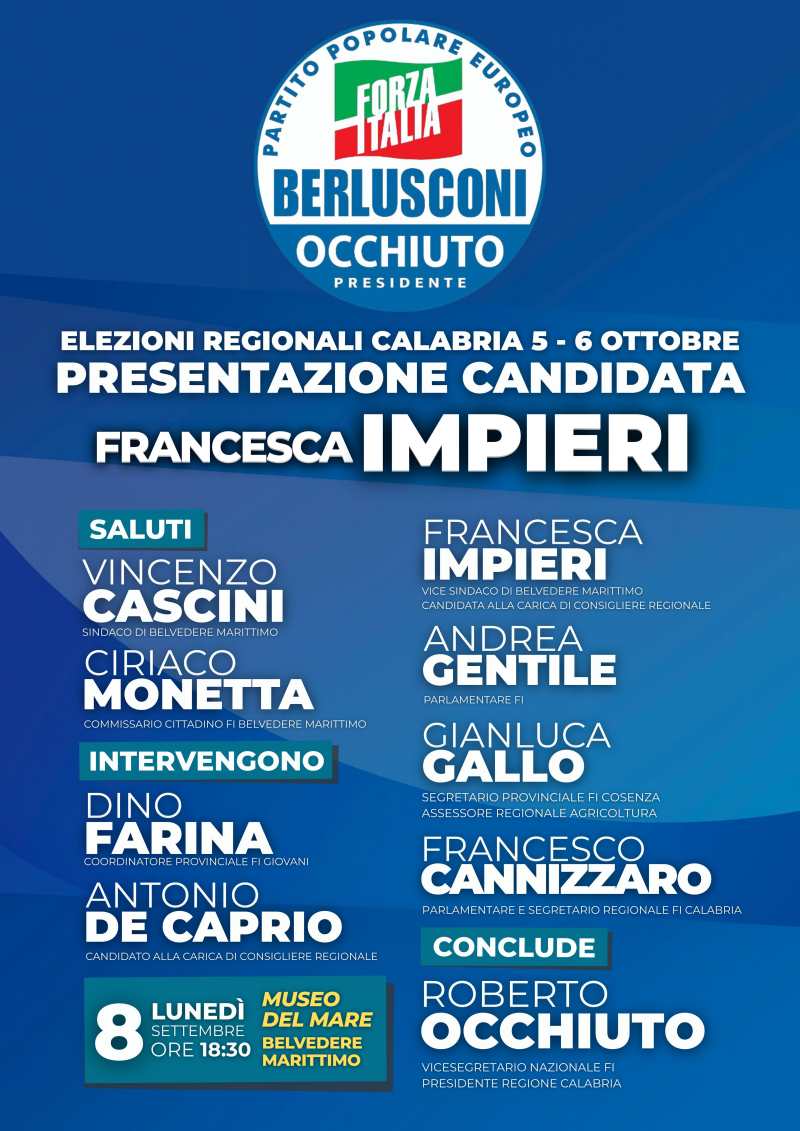 «Scendere in campo oggi significa assumersi una responsabilità verso la propria terra. La mia candidatura nasce dalla volontà di dare voce al Tirreno cosentino e a tutta la provincia, e di contribuire così – partendo dai territori e dalle realtà locali – al futuro della Calabria». Con queste parole Francesca Impieri, vicesindaca di Belvedere Marittimo, annuncia l’avvio della sua campagna elettorale per le Regionali del 5 e 6 ottobre, nella circoscrizione Nord, con la lista di Forza Italia. L’apertura ufficiale si terrà lunedì 8 settembre alle ore 18:30 presso il Museo del Mare della cittadina tirrenica.