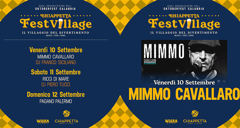Da venerdi 10 a domenica 12 settembre si ricomincia con tre giorni ricchi di musica e divertimento. Si parte venerdì 10 settembre con Mimmo Cavallaro che ‘riaprirà’ la rassegna.