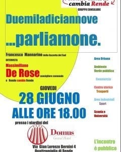 Si terra’ alle 18.00 del 28 giugno presso l’Hotel Domus di Quattromiglia di Rende l’incontro pubblico organizzato dal gr­uppo consiliare Rende cambia Rende.
