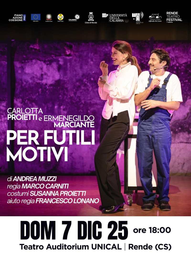 L’Università della Calabria si prepara ad accogliere, domenica 7 dicembre 2025 alle ore 18:00, l’attrice Carlotta Proietti con la commedia “Per Futili Motivi”, in scena presso il Teatro Auditorium Unical.