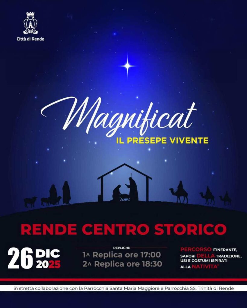 Il 26 dicembre, uno degli appuntamenti più attesi delle festività natalizie torna a illuminare il cuore del borgo antico di Rende: il “Magnificat”, il Presepe Vivente che quest’anno si arricchisce di un nuovo format, trasformandosi in un musical itinerante. Un evento unico che unisce tradizione, musica e spiritualità, dando vita a una rappresentazione che coinvolge il pubblico in un’esperienza immersiva e suggestiva nel centro storico della città.