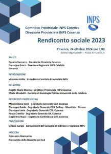 Oltre ai saluti del presidente della Provincia, Rosaria Succurro, e del direttore regionale dell’Inps, Giuseppe Greco, sono previste, dopo l’intervento introduttivo di Vincenzo Grillo, presidente del comitato provinciale, le relazioni di Angelo Maria Manna, direttore provinciale dell’Inps e Maria Mirabelli, docente di sociologia politica all’Unical.