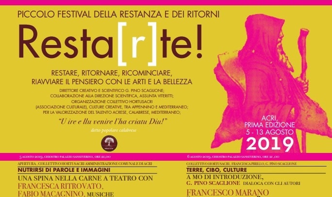 Prende il via il 5 agosto alle 21,00, nel chiostro del Palazzo Sanseverino-Falcone, la prima edizione di “Resta[r]te!-Festival della Restanza e dei Ritorni”, organizzato dall’Associazione HortusAcri, con la direzione creativa e scientifica di Pino Scaglione e di Assunta Viteritti, docenti acresi in prestigiose università italiane.