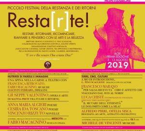 “Resta[r]te!” è un festival di resilienza, un Laboratorio di sperimentazione di differenti linguaggi, dalla televisione, al teatro, alle letterature, la musica, le arti visive, con una Summer School di Design Resiliente, che si svolge a cavallo del Festival –dal 28 luglio al 6 agosto- e che vede protagonisti giovani allievi e docenti architetti di varia provenienza. “Resta[r]te!” non è, non intende essere un episodio effimero, isolato, bensì l’esito di un lavoro avviato da tempo sul territorio acrese, la conclusione, in festa e riflessione cultural-spettacolare, su tante questioni aperte: un riavvio, una continuazione.
