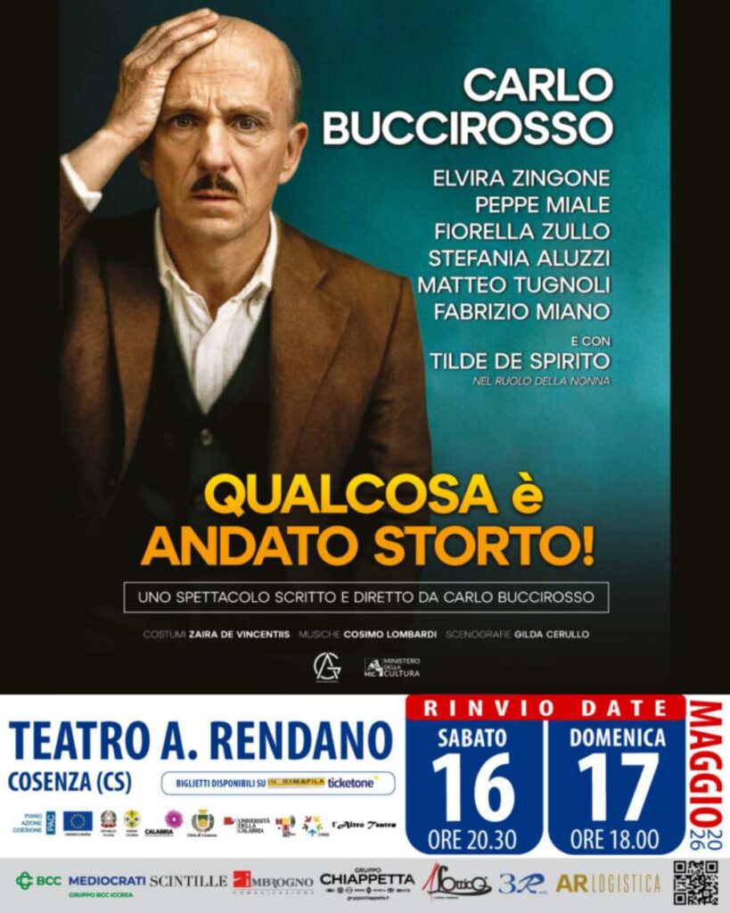 Lo spettacolo “Qualcosa è andato storto” in programma questa sera, venerdì 24 aprile e sabato 25 aprile, nell’ambito della Rassegna L’Altro Teatro, è stato rinviato a causa di un sopraggiunto problema di salute di uno dei protagonisti. La commedia scritta e diretta da Carlo Buccirosso si terrà sabato 16 maggio 2026, alle ore 20.30, e domenica 17 maggio, alle ore 18.00. Insieme a Buccirosso salirà sul palco un affiatato cast composto da Elvira Zingone, Peppe Miale, Fiorella Zullo, Stefania Aluzzi, Matteo Tugnoli, Fabrizio Miano e Tilde De Spirito.
