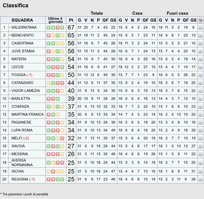 Il 31º turno si è concluso con il ritorno in solitaria da capolista per la Salernitana, i granata hanno espugnato il “Ceravolo” di Catanzaro all’ultimo secondo di gara per 2-1. Il big match tra Casertana e Benevento è finito 0-0. Ha pareggiato anche la Juve Stabia, 1-1 al Menti nel derby contro l’Ischia. Impatta anche il Matera in casa contro la Vigor Lamezia, i lucani si bloccano dopo la vittoria in trasferta a Salerno. Torna alla vittoria il Lecce superando l’Aversa Normanna per 3-0. Sono tanti in generale i pareggi, Il Messina fa 0-0 con il Cosenza, finisce invece 1-1 tra Lupa Roma e Foggia. Vince la Reggina, un 2-1 al “Granillo “contro il Melfi.