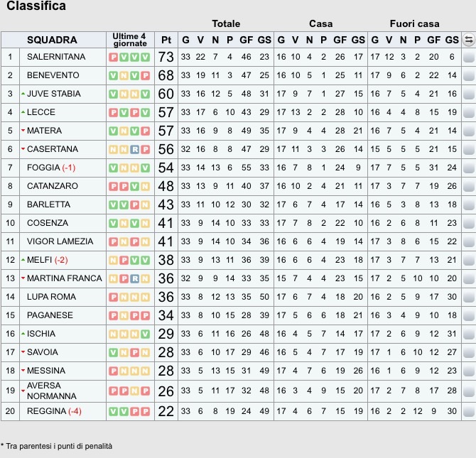 Nel girone C di Lega Pro dopo il 33º turno la Salernitana si avvicina ulteriormente alla promozione. I granata vincono in casa della Paganese grazie ad un autogol di Moracci e volano a +5 sul Benevento, sconfitto a Lecce: decide Papini, abile a deviare in rete una punizione di Herrera. A partita finita espulso il portiere dei sanniti Pane per un calcio rifilato ad Embalo.