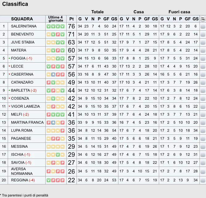 Salernitana inarrestabile anche nel 34º turno, i campani travolgono la Lupa Roma e consolidano il primato. Il Benevento risponde superando tra le mura amiche con un secco 4-0 una Reggina quasi condannata ai dilettanti. La Juve Stabia si aggiudica il derby con il Savoia ottenendo un 3-1 in trasferta preziosissimo.