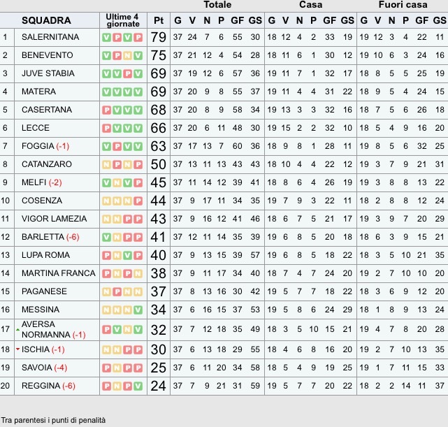 Tante emozioni nel 37º turno del Girone C di Lega Pro. Restano aperti tutti i discorsi sia in testa che in coda. In vetta sconfitta per Salernitana, al “San Filipo” con il Messina. Non sbaglia il colpo a Cosenza il Benevento, conquistando così la miglior posizione per i playoff. Contesa interessante per gli altri due posti, la Juve Stabia vince con fatica contro la Vigor Lamezia. Il derby lucano tra Matera e Melfi, sorride alla compagine biancazzurra, incalza la Casertana, che rifila un poker al Savoia, il Lecce supera 3-0 l’Ischia.