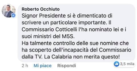 Il suo messaggio è molto chiaro e diretto: “Presidente, si è dimenticato una cosa importante: il commissario Cotticelli lo ha nominato lei. Doveva scoprirlo dalla TV le sue incapacità? La Calabria non merita questo“.