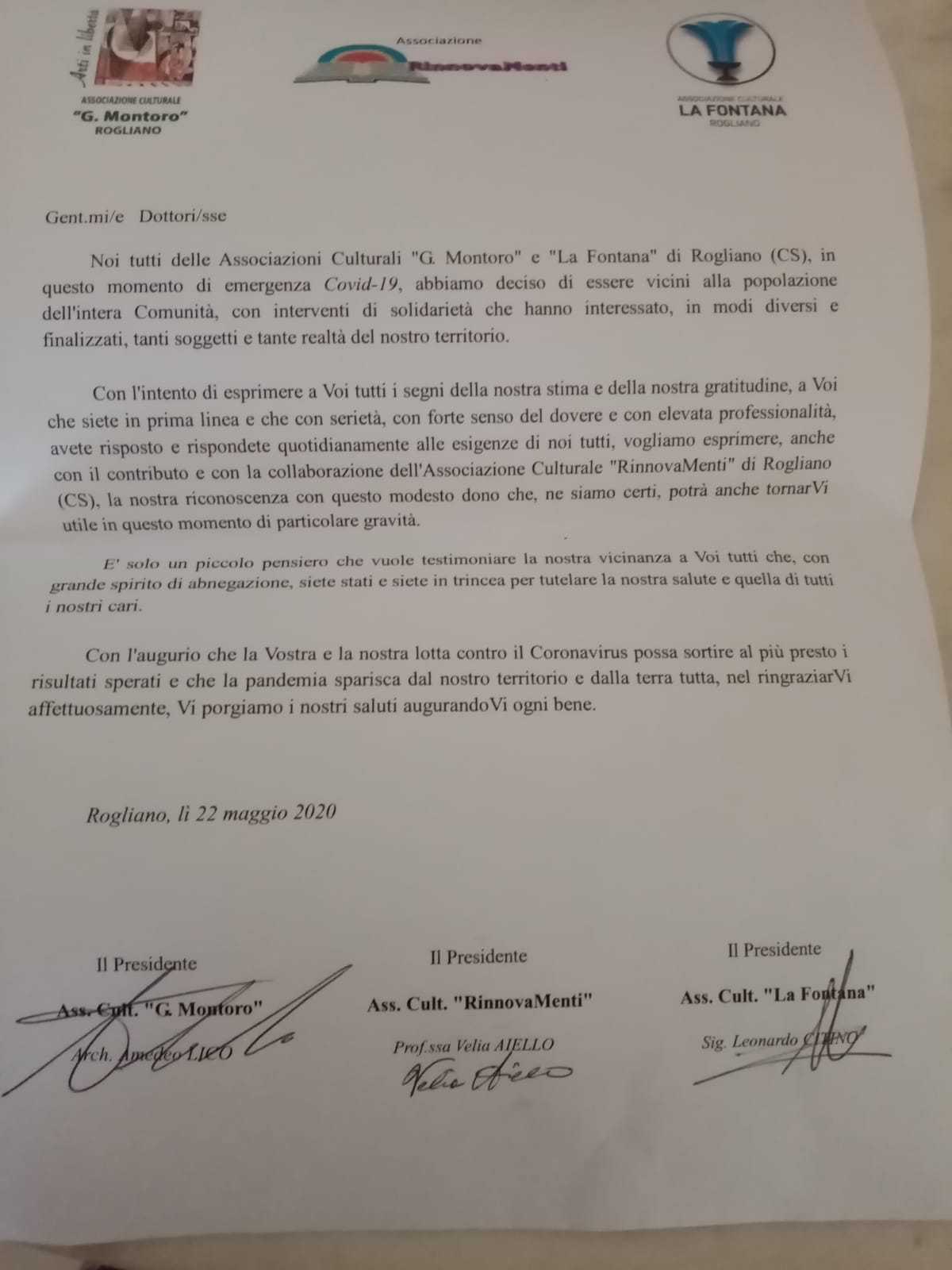 Anche l’associazione Rinnovamenti, pur avendo finalità prettamente culturali, ha deciso di collaborare con le suddette associazioni quando si è intrapresa l’iniziativa di rivolgere un pensiero ai medici del territorio.